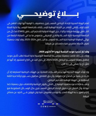 وبخصوص القرار المتعلق بالمنع من الإنتداب في فرعي كرة القدم بسبب قضية رفعها الليبي عبد المهيمن الهمالي والسلة بسبب قضية رفعها زياد الشنوفي فقد أوضحت الهيئة أنها بصدد إتخاذ الإجراءات اللازمة لتجاوز هذه الإشكاليات في أقرب الآجال الممكنة.