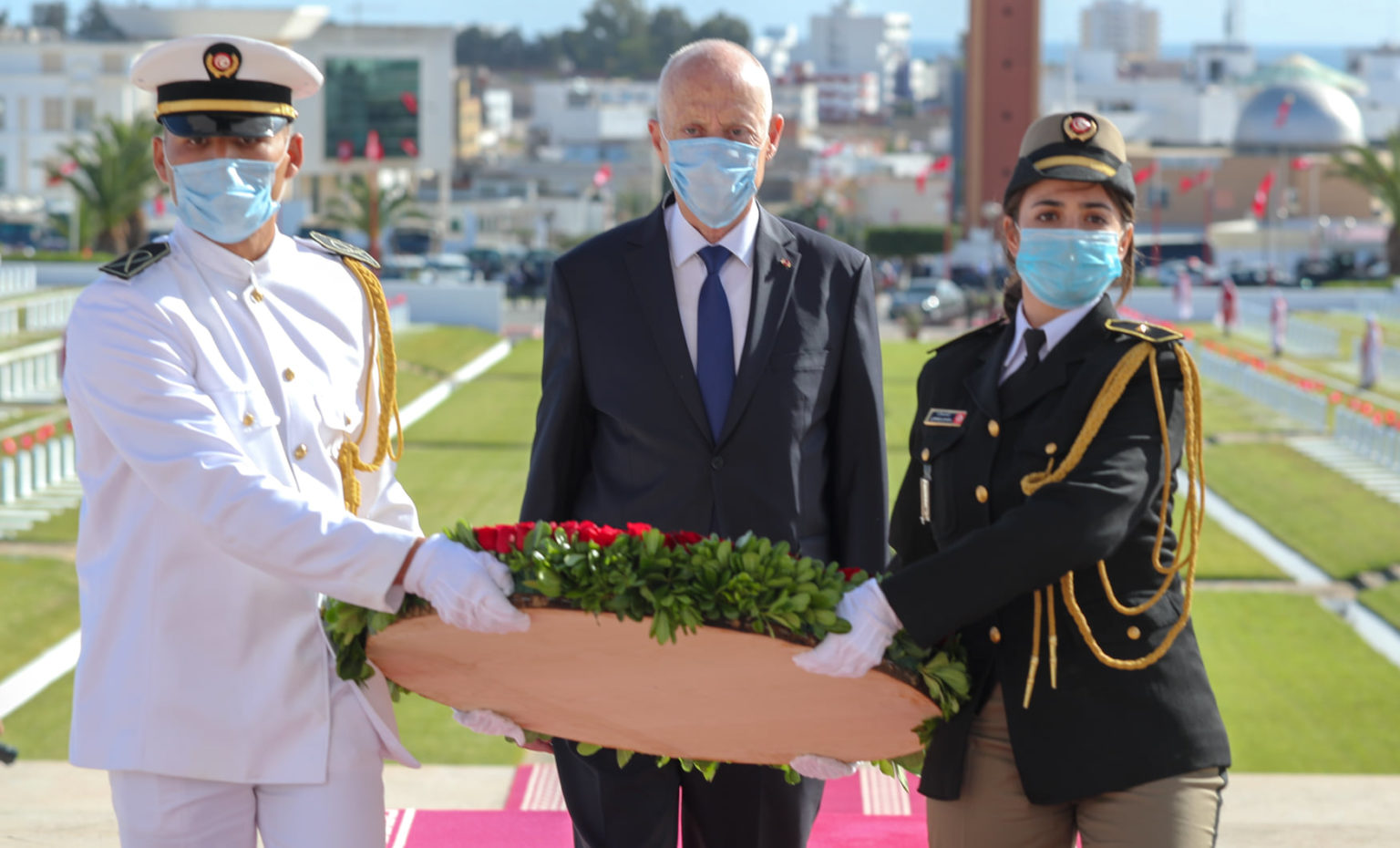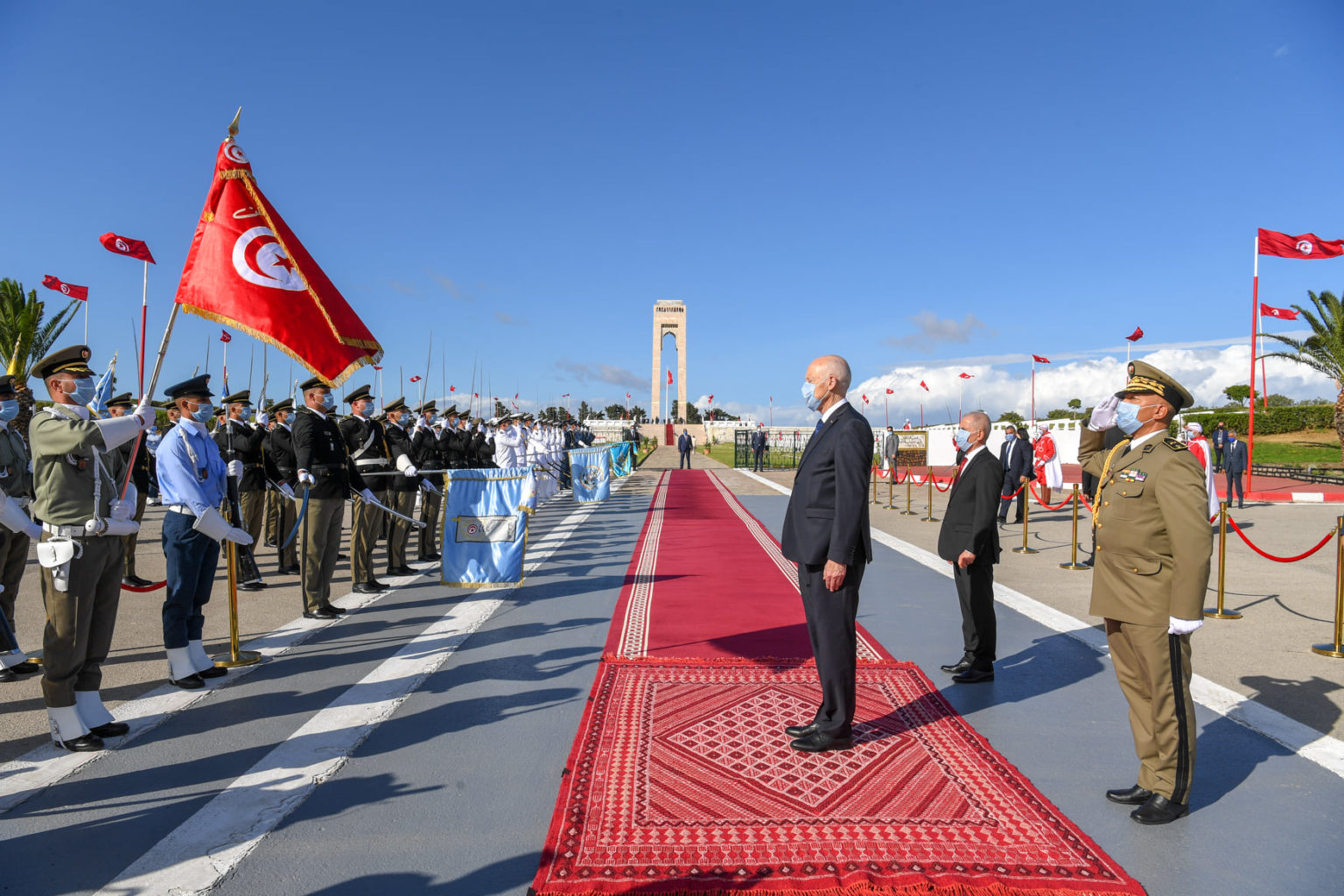 ثم تحول رئيس الجمهورية والوفد المرافق له إلى روضة الشهداء حيث أدى تحية العلم على أنغام النشيد الوطني، كما استعرض تشكيلة شرفية من الجيوش الثلاثة قبل التوجّه الى النصب التذكاري حيث وضع إكليلا من الزهور وتولى قراءة الفاتحة ترحّما على أرواح الشهداء.